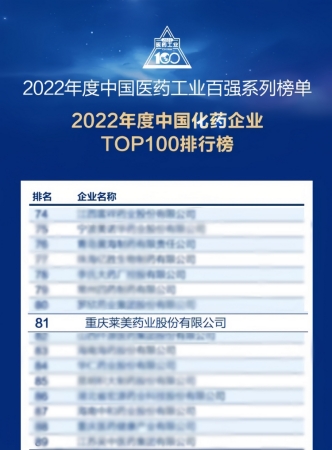 6月27日,2022年中國醫藥工業百強系列榜單發布,萊美藥業以良好的綜合實力、研發創新力及社會影響力,入選“2022年度中國化藥企業TOP100排行榜”,位列榜單第81位。