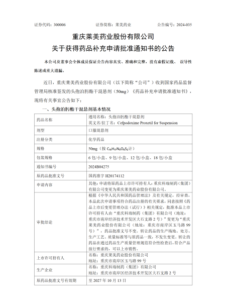 近日,重慶萊美藥業股份有限公司收到國家藥品監督管理局核準簽發的頭孢泊肟酯干混懸劑(50mg)《藥品補充申請批準通知書》,通知書編(bian)號:2024B04275,該藥品上(shang)市許可持(chi)有(you)人由重慶(qing)科瑞制藥(集團)有(you)限公司變更(geng)為重慶(qing)萊(lai)美藥業股份有(you)限公司。