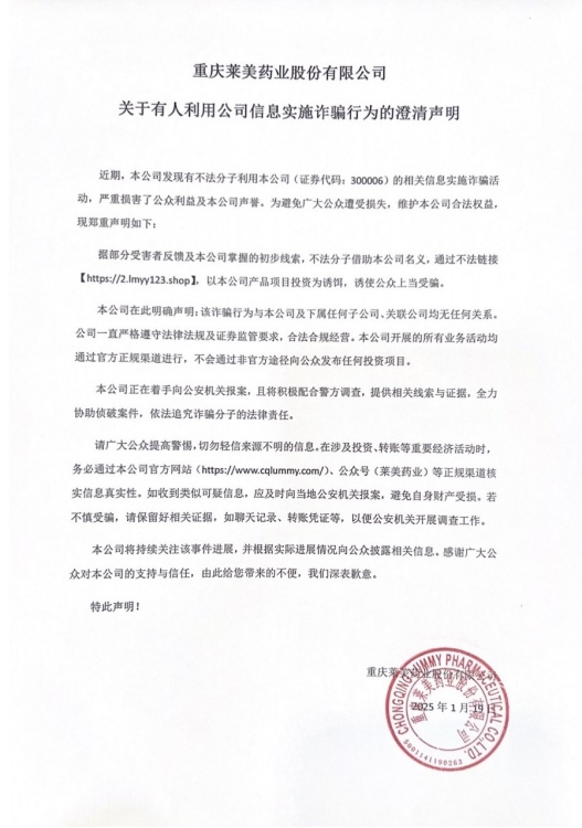重慶萊美藥業股份有限公司關于有人利用公司信息實施詐騙行為的澄清聲明