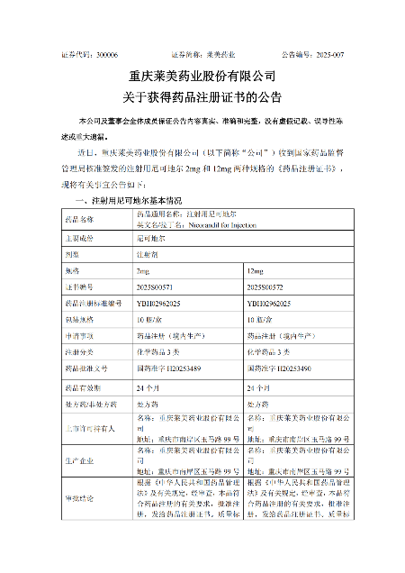近日,重(zhong)慶萊美藥(yao)(yao)業股份有限公(gong)司(si)(以下簡稱“公(gong)司(si)”)收到國家藥(yao)(yao)品(pin)監督管理局(ju)核準簽發(fa)的注(zhu)射用尼可地爾 2mg 和 12mg 兩種規(gui)格的《藥(yao)(yao)品(pin)注(zhu)冊(ce)證書》,證書編號:2025S00571、2025S00572。