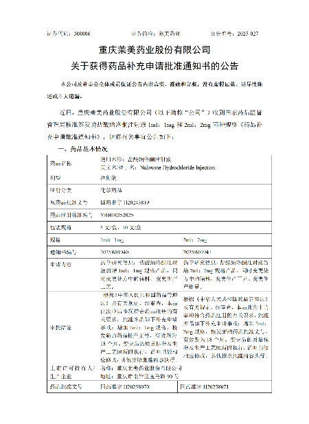 近日,萊美藥業收到國家藥品監督管理局核準簽發的鹽酸納洛酮注射液1ml:1mg和2ml:2mg兩種規格《藥品補(bu)充申請批準通知書》通知書編號:2025B01940、2025B01941。