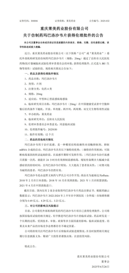 近日,萊美藥業委托外部機構研發的仿制藥瑪巴洛沙(sha)韋(wei)片(注冊分類:化藥4類;規格:20mg)通過了岳陽市人民醫院藥物/醫療器械臨床試驗倫理審查委員會的審批,獲得倫理批件,正(zheng)式進入 BE(生物等(deng)效性)試(shi)驗階段。