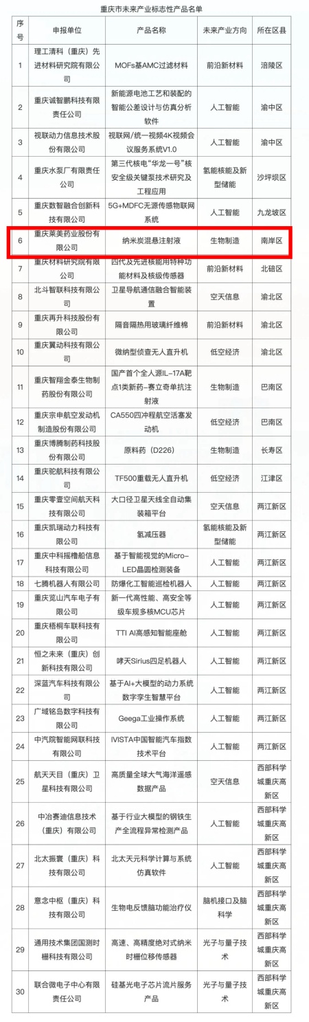 2025年7月22日,重慶市經濟和信息化委員會正式公示“重慶市未來產業標志性產品名單”,萊美藥業自主研發的“納米炭混懸注射液”作為生物(wu)制造領域代表產品(pin)成功入選。